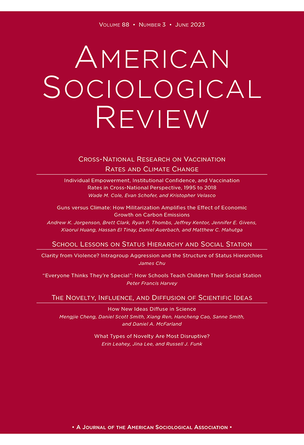Jorgenson, Andrew K., Brett Clark, Ryan P. Thombs, Jeffrey Kentor, Jennifer E. Givens, Xiaorui Huang, Hassan El Tinay, Daniel Auerbach, and Matthew C. Mahutga. 2023. “Guns Versus Climate: How Militarization Amplifies the Impact of Economic Growth on Carbon Emissions.” American Sociological Review 88(3): 418-453.